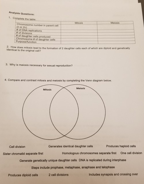 Solved Analysis Questions 1 Complete The Table Meiosis